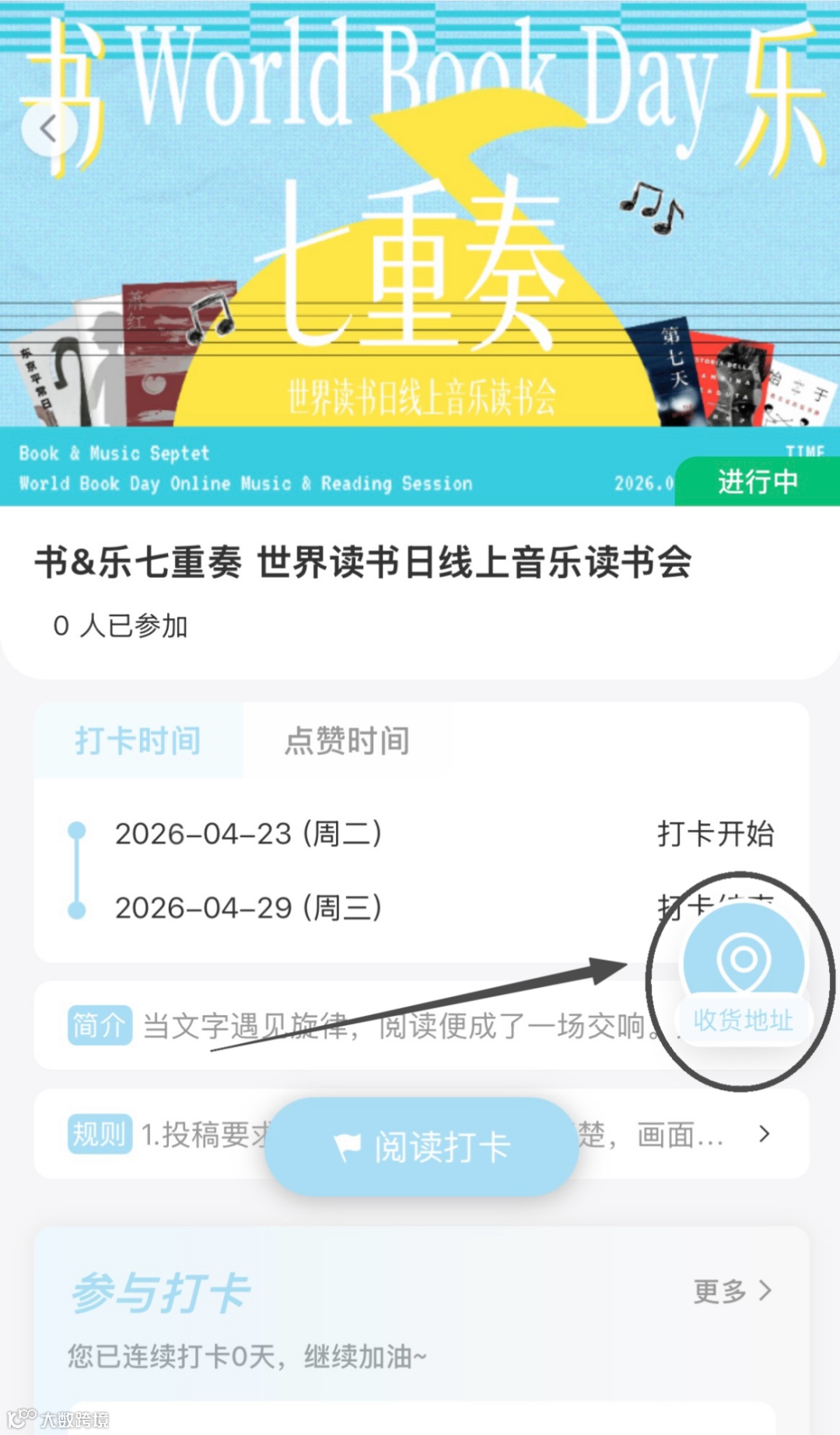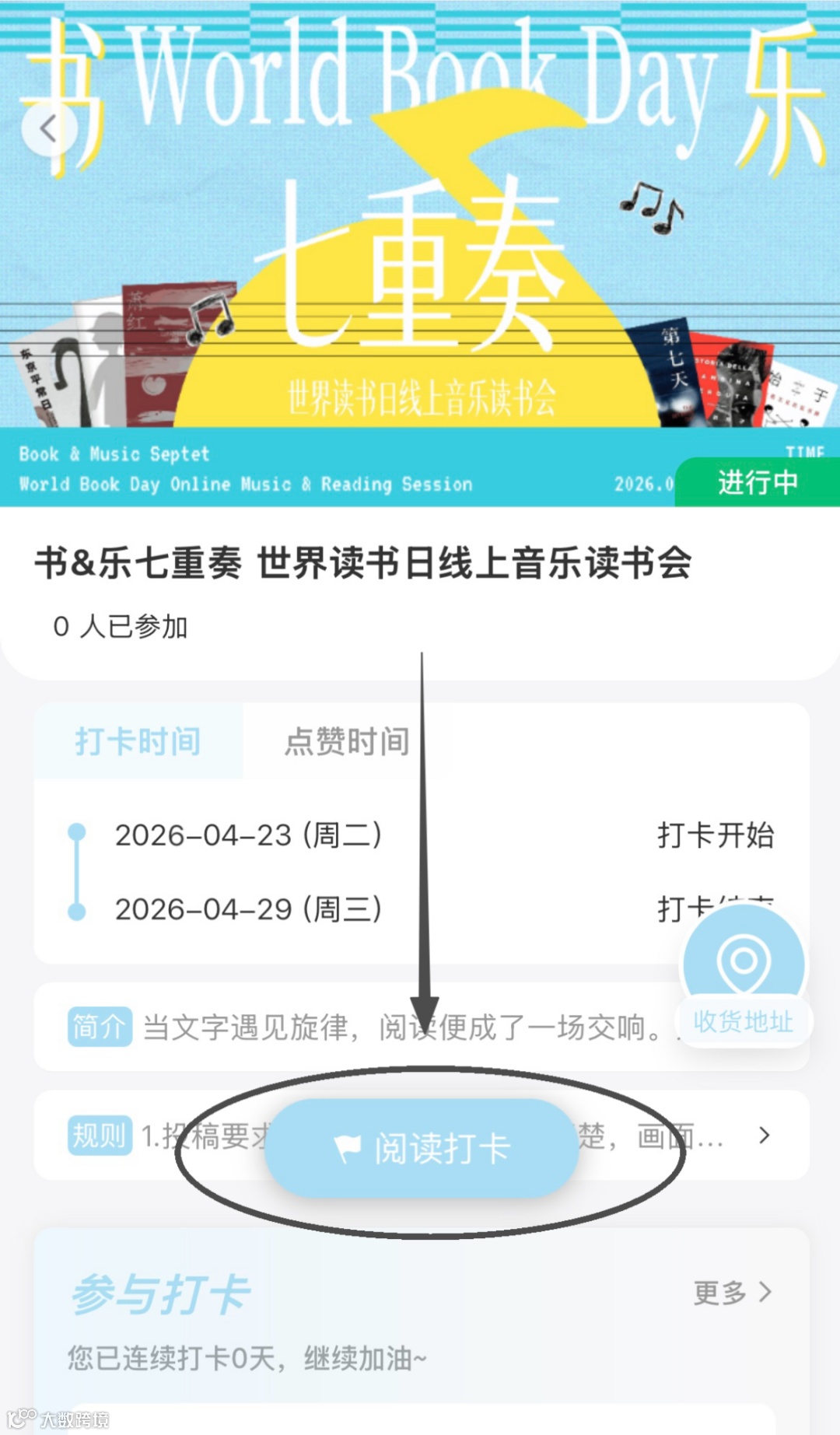 2.1选择“书&乐七重奏 世界读书日线上音乐读书会”进入活动界面,根据每日对应主题,点击“阅读打卡”进入提交打卡页面;