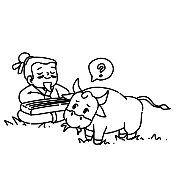 公明仪心想,是不是曲子太高级,牛听不懂?于是改弹小曲,牛还是没反应。他不服输,使出浑身解数弹奏拿手曲目,牛最多甩甩尾巴赶牛虻,压根不抬头。
