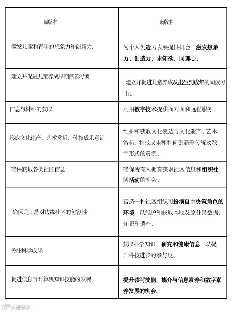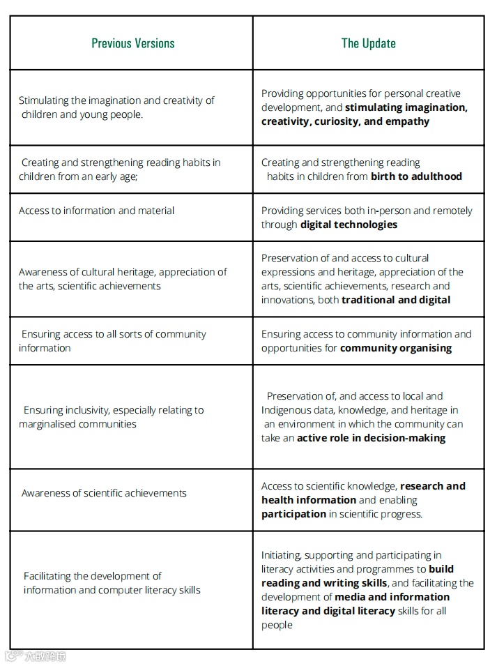 英文版来源于 IFLA.Themissionofthepubliclibraryoftoday:what'snewinthepubliclibrarymanifesto[EB/OL].(2022-07-22)[2022-08-07].https://repository.ifla.org/bitstream/123456789/2007/1/The%202022%20IFLA-UNESCO%20Public%20Library%20Manifesto%20at%20a%20Glance.pdf.