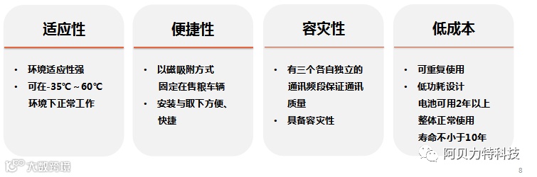 阿贝力特科技磁力车辆电子标签高度集成了无线通信、RFID、压力检测、磁场检测等功能。在粮食收购智能管理系统中,作为信息载体,实现将车辆、样品、检验、过磅结果的信息自动关联。涵盖一卡通、车牌识别、二维码、一次性电子标签等应用功能,实现电子通讯与车辆监管的双重作用。