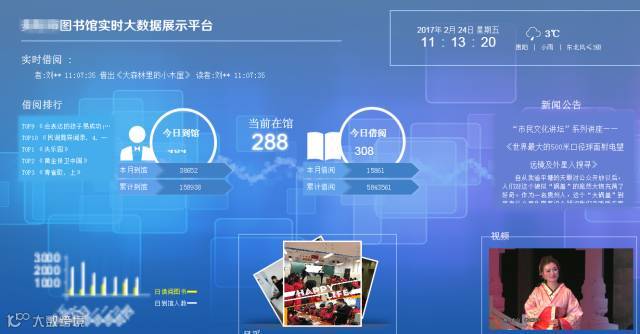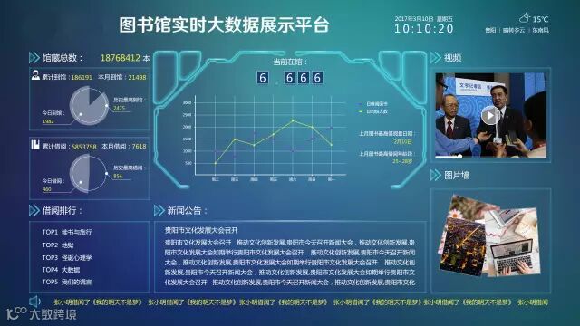慧览馆情大数据动态墙可与图书馆业务管理系统连接,实时处理、统计、同步图书馆的相关数据,再以文字、图片、视频等形式展现出来。具体包括以下功能: