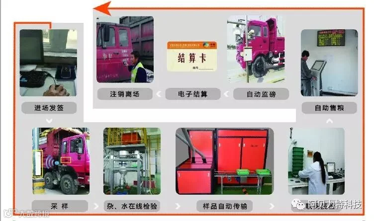 在传统粮库作业流程中,在收粮过程, 进场、扦样、过磅、卸粮等每个环节都需要多人参与,工作效率较低,同时流程作业不规范,且都存在漏洞。所以在“粮食收购智能管理系统”中实现自动扦样,杂质、水分在线检验,样品自动传递,余粮自动处理等方式的自动化。