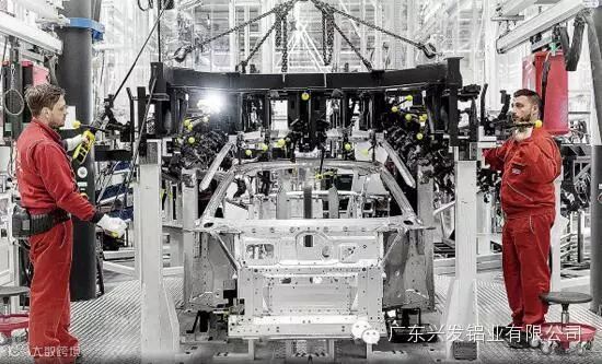 该工厂于2014年秋季开始投产新R8车体框架。这里主要生产各种高端且具备轻量化设计的小批量量产车型。 新R8这款高性能跑车的ASF复合材料车体框架仅重200公斤,不过却十分坚固抗撞,它由70%的铝质材料和13%的碳纤维复合材料打造而成——铝型材由其重量轻、易加工等性能使其又华丽丽的进入我们视线里。