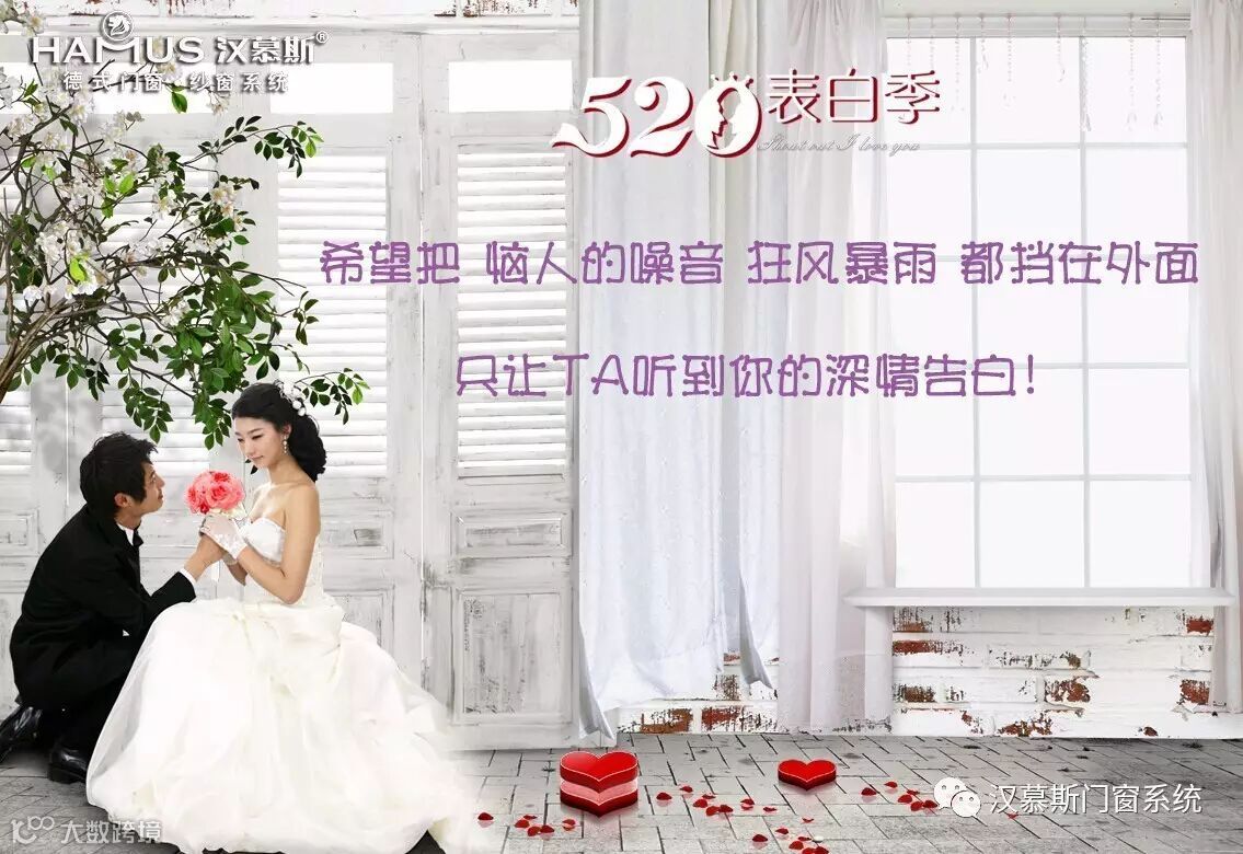 对恋爱的情侣来说,520是表达心声的节日,对单身汪们来说,520是脱单的好时机。作为汉慕斯门窗的我们,教您一招520表白成功必杀技:给TA一个家,在家里装一套汉慕斯系统门窗。给对方既实在又安全的呵护,才是最直击心灵的告白。