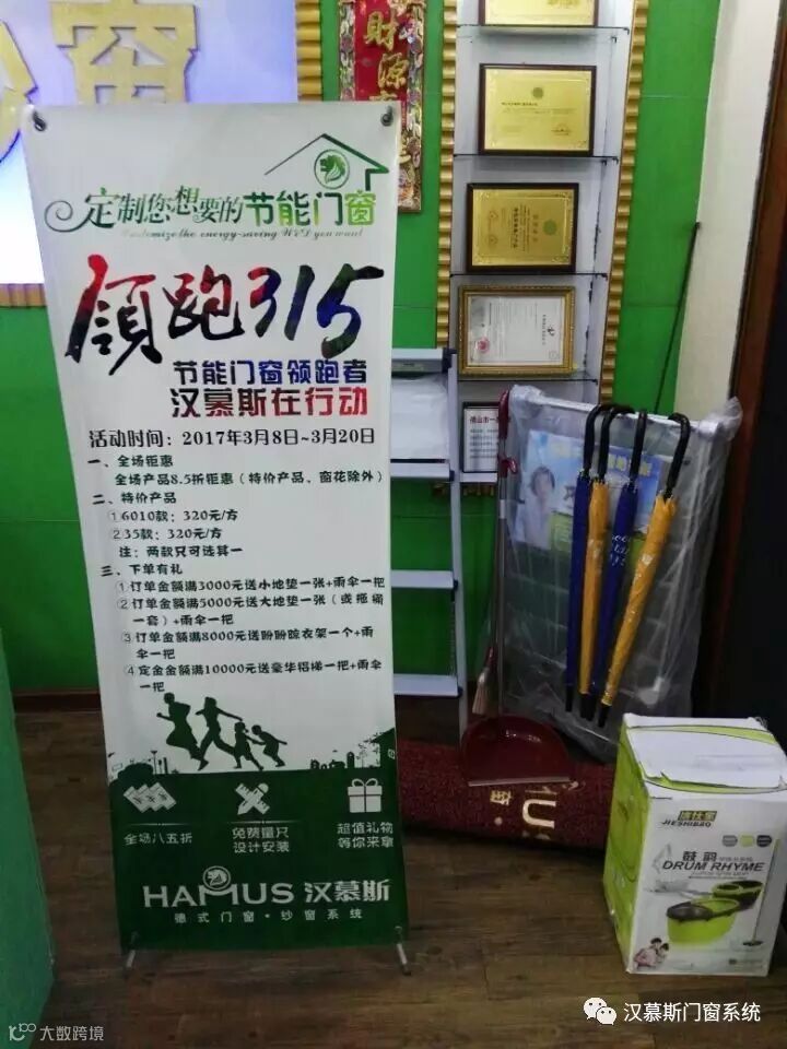 一年一度315国际消费者权益日来临之际,汉慕斯门窗在全国范围内启动“领跑3.15节能门窗领跑者-汉慕斯在行动”为主题的大型促销活动,回馈广大新老顾客朋友们!届时,只要您去到汉慕斯门窗全国任何一家专卖店,即可享受多重好礼特惠。