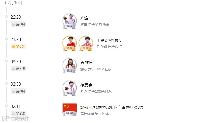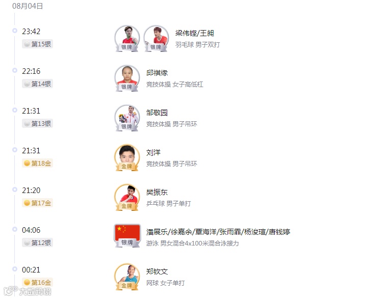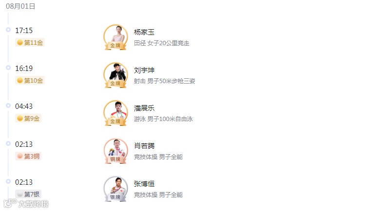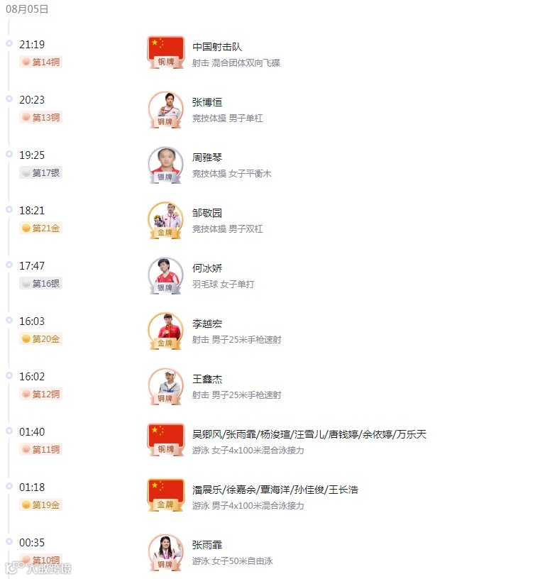 截止8月5日,中国奖牌榜: