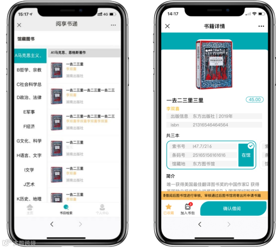 使用端:供读者快速检索图书,支持多本图书一键下单,个人阅读账单清晰记录。