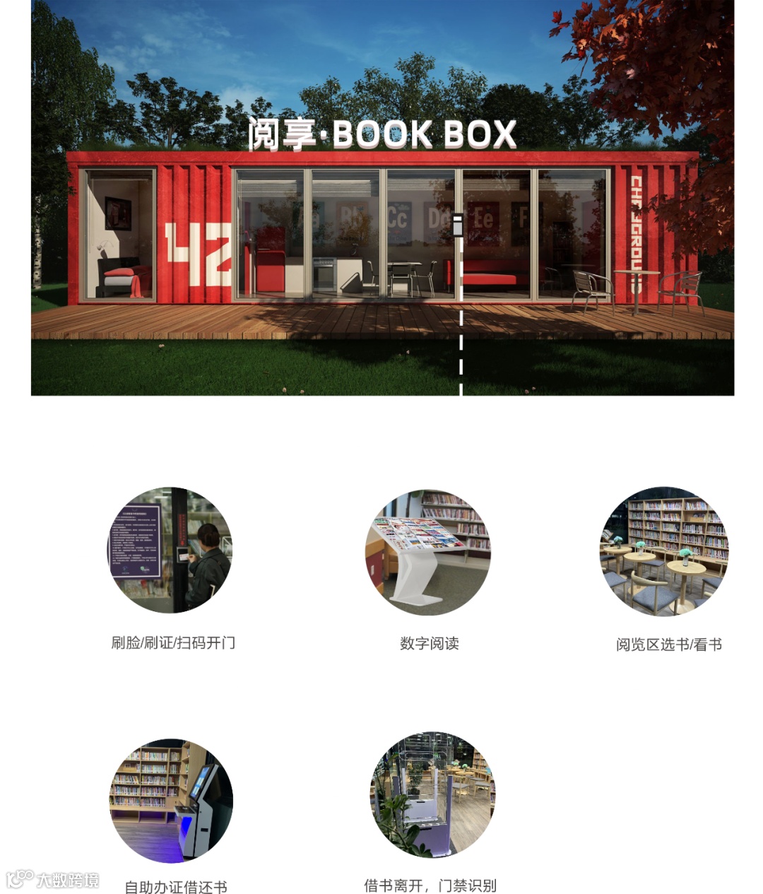 BOOK BOX 组合LOFT由两个智慧阅读BOOK BOX+露台阅读区组合构成,一层及架空设计的二层BOOK BOX空间可根据需求划分功能区,存放图书、数字阅览、读者证及借还书办理区,阅读区.....此款组合BOOK BOX,无论从外部组合的设计感及色彩碰撞的视觉感,或是功能分区的组合感,都能完美诠释出24小时智慧书屋带给读者的阅读生活美学,让读者流连忘返,打卡传播,提高书屋人流量及图书流通量,进而加快全民阅读的推广。