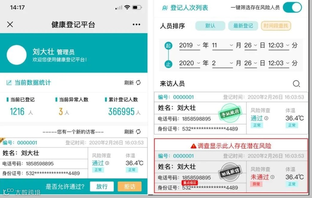场馆后台数据实时精准筛查,潜在风险人员信息实时预警,降低到馆人员健康风险。