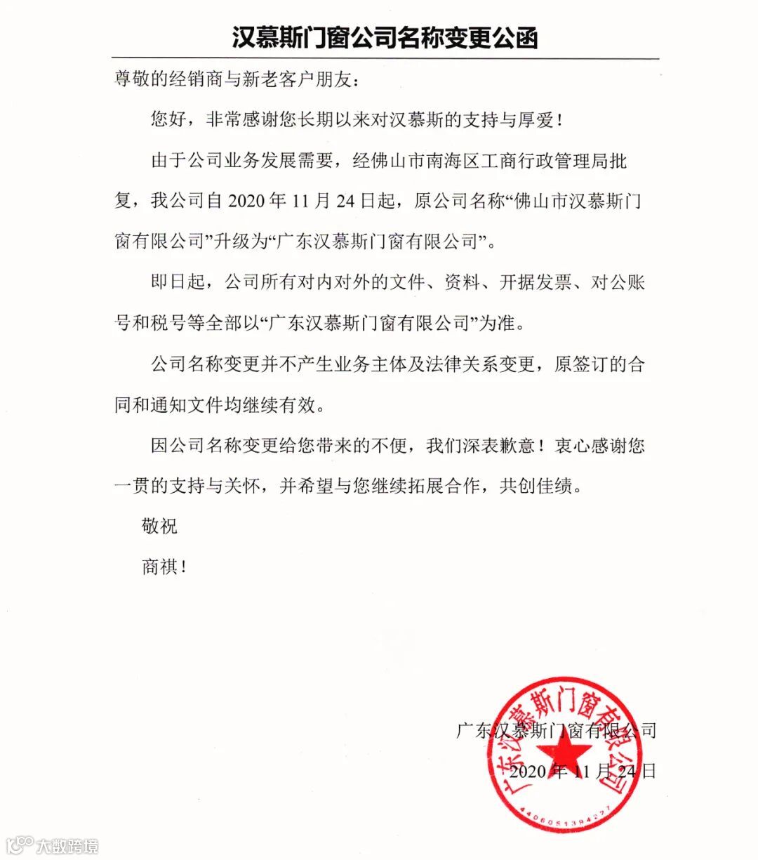 市汉慕斯门窗有限公司已正式更名为“广东汉慕斯门窗有限公司”!