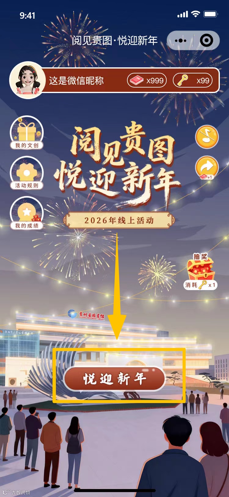 3.收集好「新年钥匙」点击活动主页的「抽奖」按钮,就能开启抽奖,惊喜文创随机掉落;抽中文创后别忘了在「我的文创」处,查看你抽到了哪些好礼哦~
