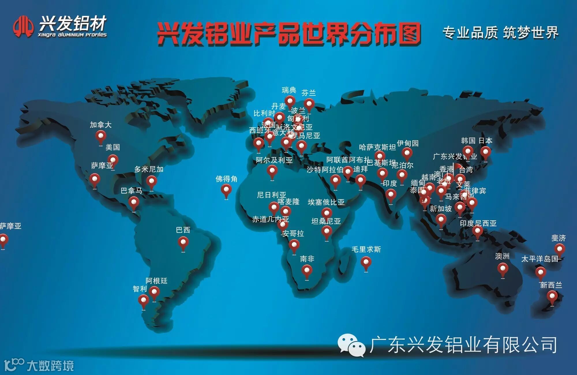 兴发铝业自1984年成立以来,经过变革发展,在海外建立了广泛而稳定的销售网络。1990年兴发开始将产品出口国外,其中不乏新加坡(1994年)、美国(1998年)、加拿大、法国、澳洲等国家及地区,产品深受青睐。
