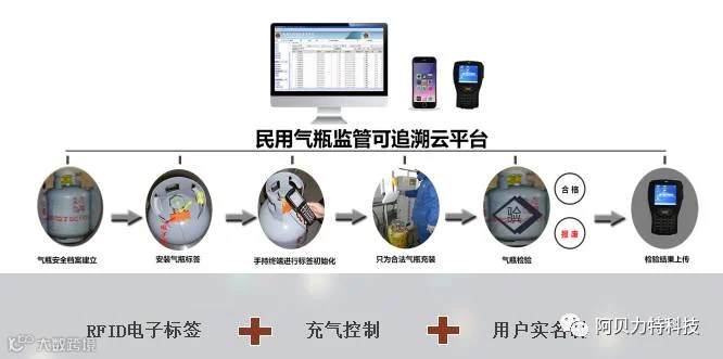 笔者搜集资料发现,阿贝力特自主研发的“民用气瓶智能监管系统”,恰好有效解决了上述问题。它通过给每个合法的气瓶上悬挂一个RFID电子标签来实现对气瓶的全流程信息化管理,做到让气瓶从“出厂-充气-用户-检验-报废”等环节实时监管并智能记录,彻底杜绝人为疏漏。相比与“第一代身份证”——条码与二维码、“第二代身份证”——智能角阀、金属标签,阿贝力特挂在钢瓶的电子标签可以作为气瓶“第三代身份证”,具有通用性强、易安装、可重复使用、不可复制、安全防爆的独特优势。