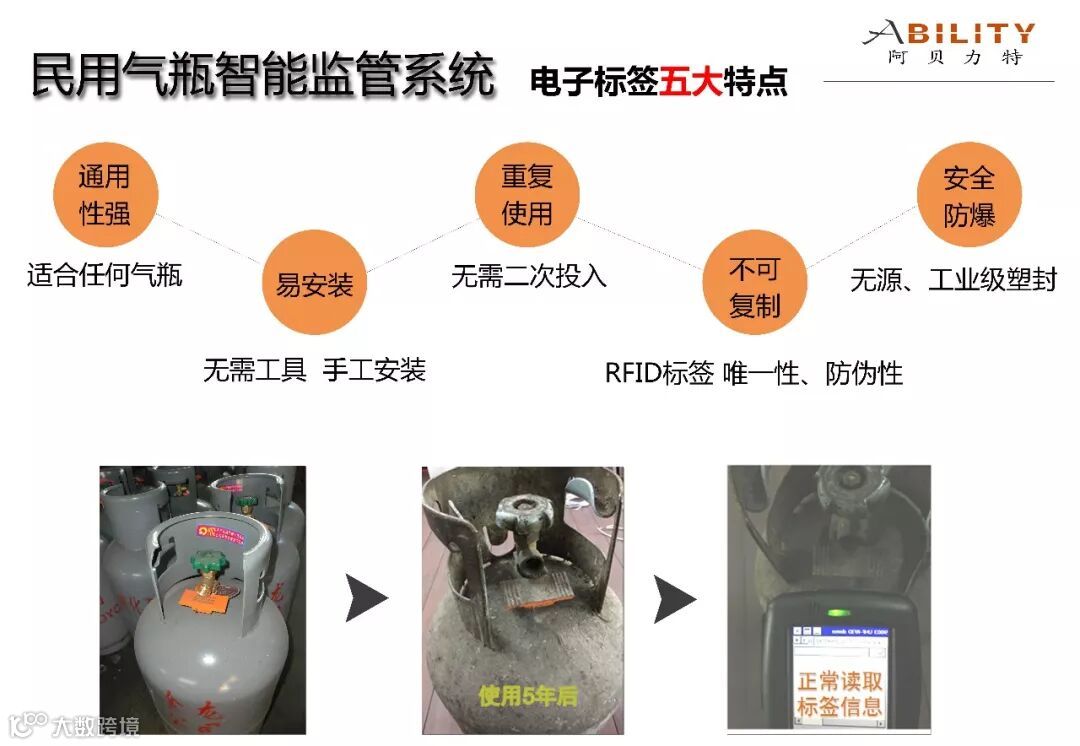 “民用气瓶智能监管系统”是阿贝力特历时9年自主研发,具有独立知识产权的专利产品。该系统由挂在钢瓶上的电子标签(发明专利)、自动读取终端、充气控制终端、手持终端、软件平台组成。通过物联网技术实现对民用气瓶全生命周期的实时监管,对应该年检、报废气瓶提前预警,对不合法气瓶系统自动拒充,达到打击非法充装、彻底杜绝劣质、报废、未检的气瓶在市场上流通使用的目的。有效落实气瓶检验和充装单位的主体责任,提升气瓶安全管理水平,防范事故发生。保障群众生命和财产安全的同时,能够实时监管,提前预警,责任溯源。