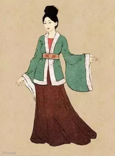 杂裾垂髾服起源于魏晋南北朝时期,又名袿衣,上衣与深衣相似,主要变化在下摆。下摆通常裁制成数个三角形,上宽下尖,层层相叠,因形似旗而名之曰“髾”。除此之外,围裳之中还伸出两条或数条飘带,走起路来,随风飘起,如燕子轻舞,煞是迷人,故有“华带飞髾”的美妙形容。
