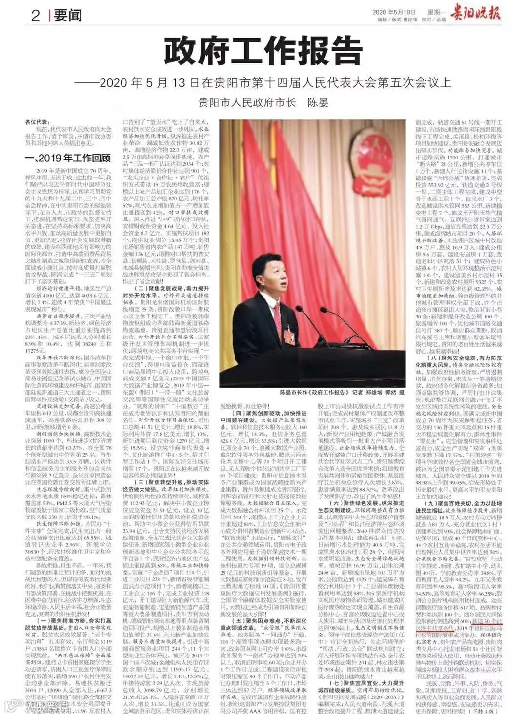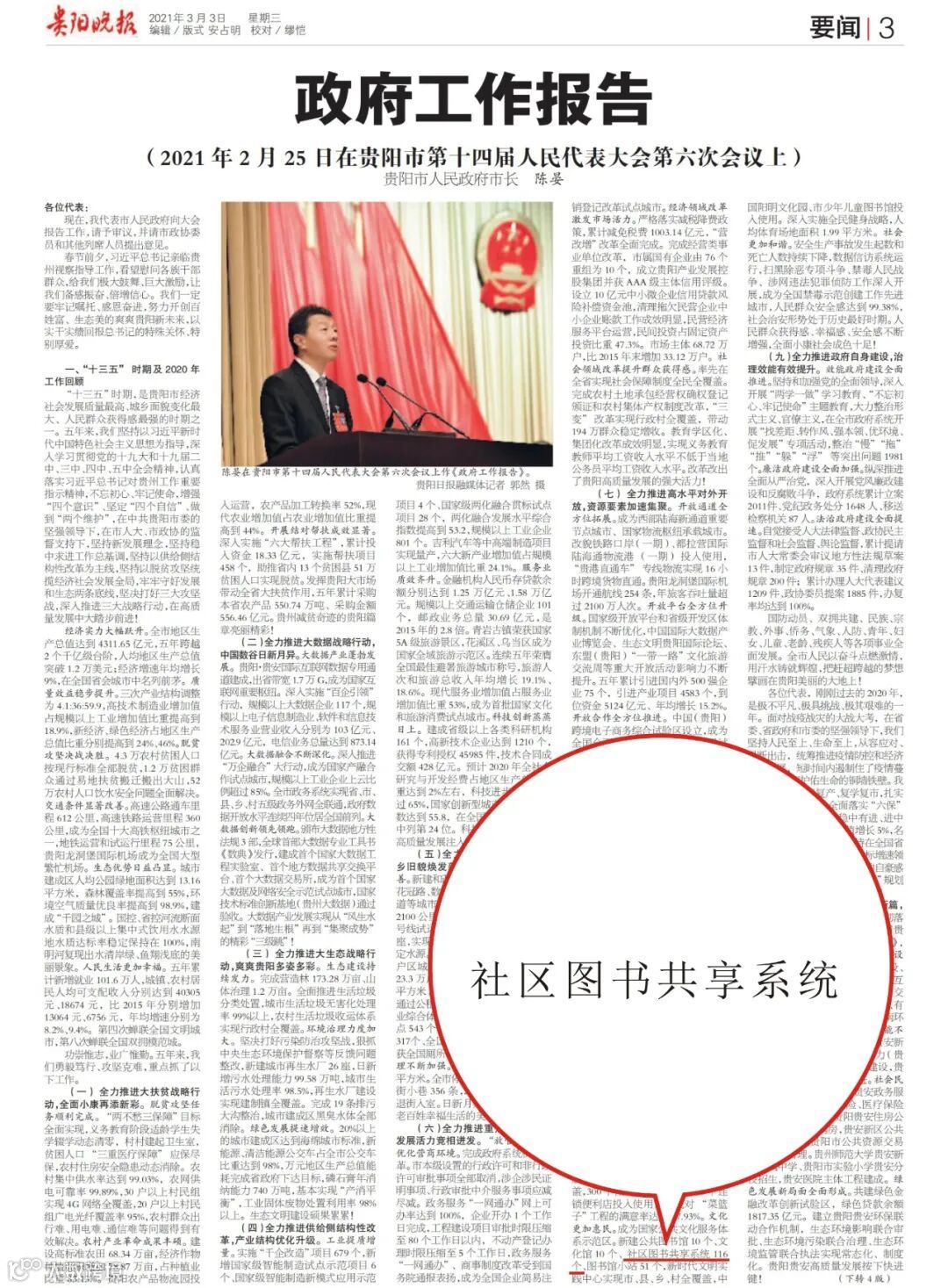 由我司承建的社区图书共享系统在2020年贵阳市两会上,作为陈晏市长政府工作报告中2019年总结项之一。
