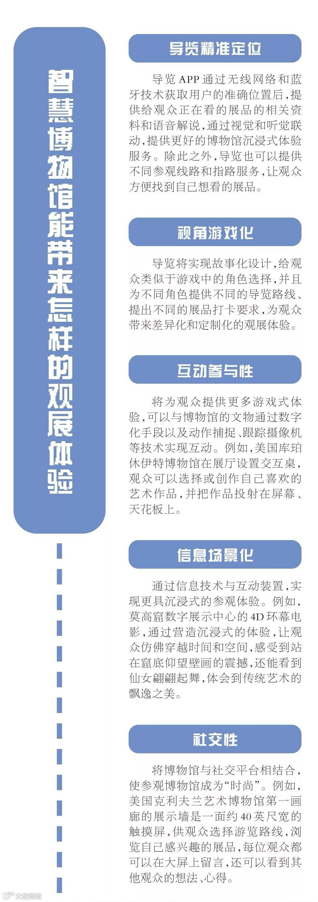 从早年的“数字博物馆”向如今的“智慧博物馆”迈进,让我们看到了移动通讯、大数据、云计算、人工智能、虚拟现实等新兴技术为博物馆行业带来的变革。业内人士预测,随着新技术、新理念不断融入博物馆行业,将带来从文物保护、藏品管理、资源共享,到博物馆展示、服务、传播等一系列深刻而持久的变化。备受期待的智慧博物馆不仅是人类历史文明精粹的珍藏地,更将成为集社会教育意义与时尚、好玩于一体的新型公共文化服务场所,那些古老的文物也将借助科技力量,真正“活”起来。