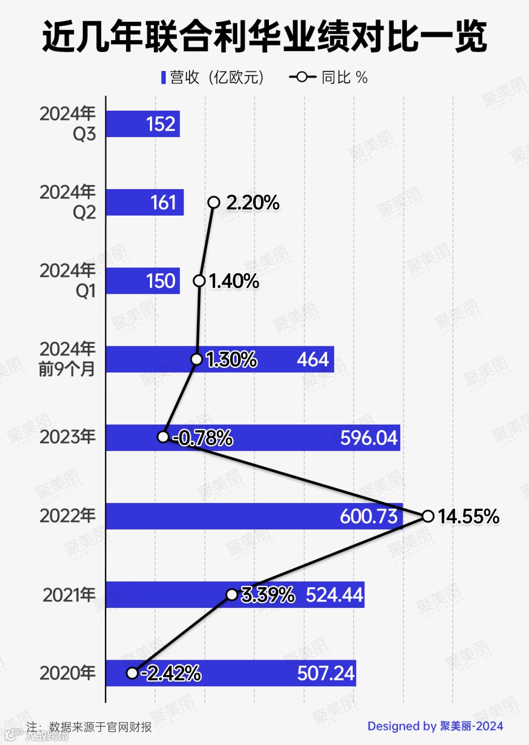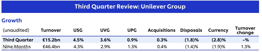 10月24日,联合利华公布了2024年第三季度业绩报告。从财报数据来看,联合利华2024年前9个月营收464亿欧元(约合人民币3556亿元),同比增长1.3%;其中,Q3营收152亿欧元(约合人民币1165亿元),基本销售额增长4.5%。