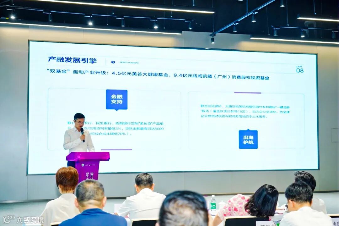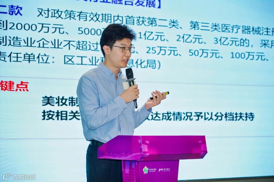 签约及授牌仪式后,“数智美妆”大讲堂按计划开讲,黄埔区市场监管局一级行政执法员朱文韬宣贯《广州开发区 广州市黄埔区促进美妆大健康产业高质量发展若干措施》即将正式发布。另外,来自广州质检院高级工程师李鑫宇、阿里巴巴国际站城市经理鲜硕、环亚集团肌肤未来品牌经理麦嘉慧、大旗财税资深咨询顾问Nikki分别围绕“化妆品相关法规热点问题介绍”、“助力中小企业出海”、“品牌及直播营销”、“美妆出海融资策略”内容作主题分享。