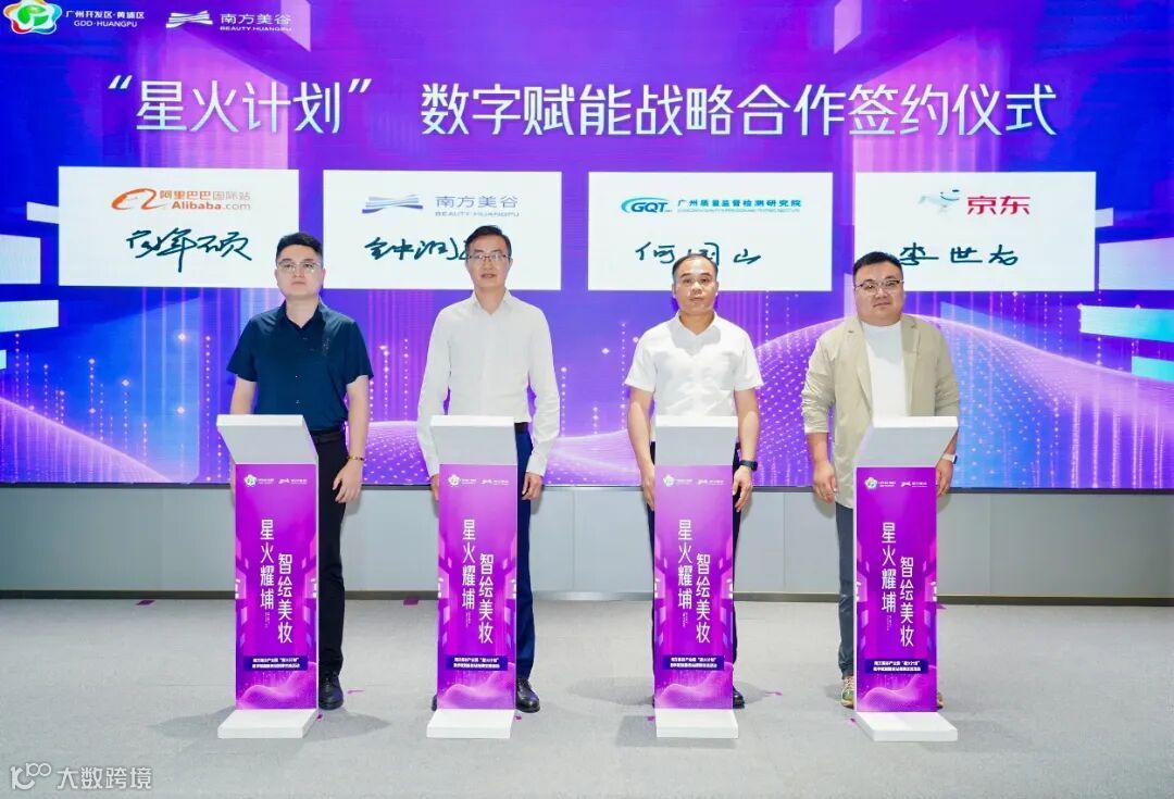 活动现场,南方美谷与广州质检院、阿里巴巴国际站、京东集团签署了“星火计划”数字赋能战略合作框架协议,在扶持中小商户、质量提升、标准共建与品牌培育等领域达成共识,共同赋能园区内美妆产业数字化升级。