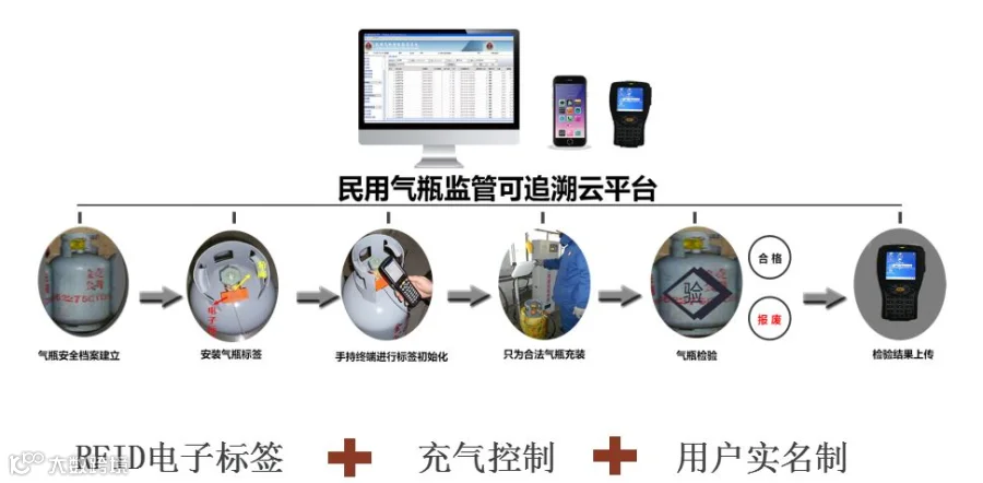 同时搭建可追溯云平台,实现瓶装燃气销售实名制。即民用气瓶智能监管可追溯云平台,包含气瓶“出厂--充气--用户--检验--报废”全部流通环节的数据记录。全面实现钢瓶出厂信息、气瓶定期报检、气瓶检验数据、气瓶充装控制、气瓶用户实名制、气瓶报废登记,气瓶安全数据分析与统计工作,大幅程度提高气瓶动态安全管理效率。使监管落到实处且不留死角。