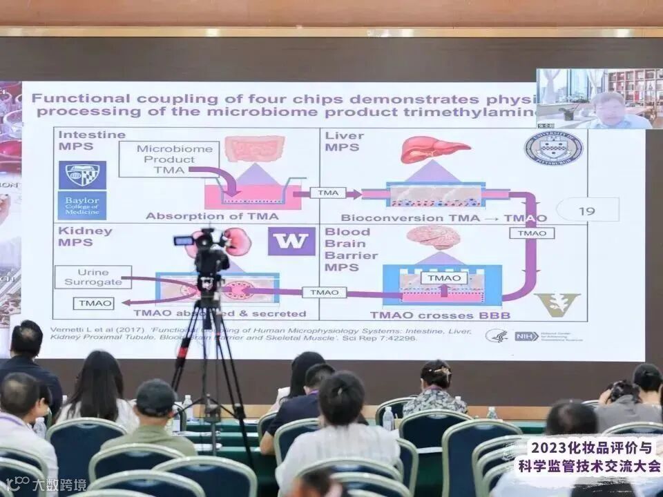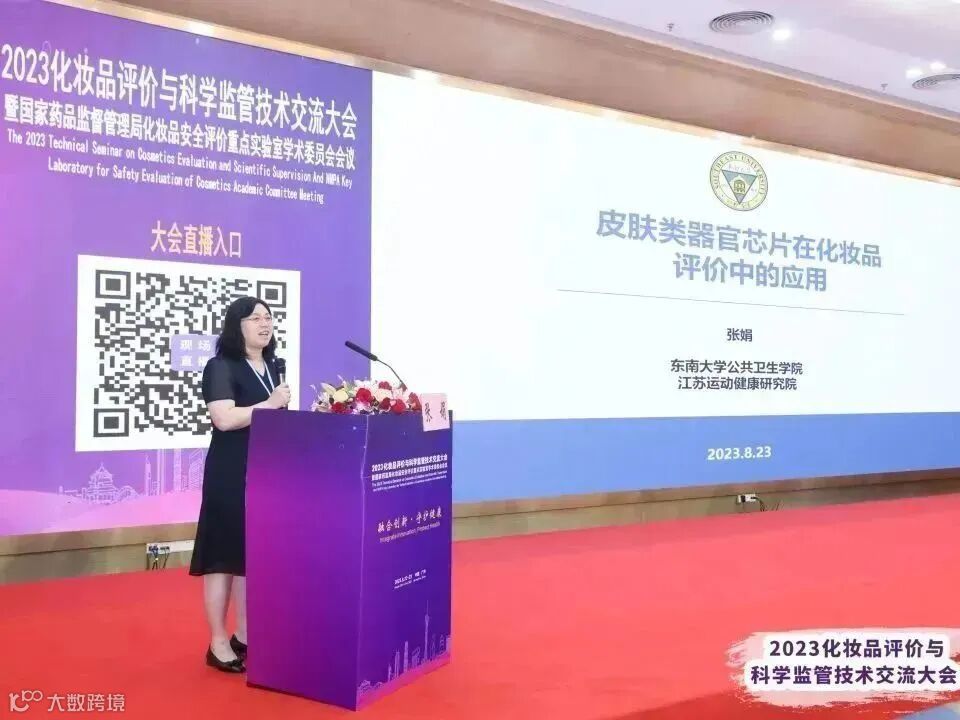 东南大学公共卫生学院教授、江苏运动健康研究院副院长张娟进行了《皮肤类器官芯片在化妆品评价中的应用》主题报告,从化妆品评价面临的挑战、皮肤芯片的创新性、皮肤芯片的构建和应用场景、AI诊断融合与展望五个方面作分享。张娟教授团队通过流路搭建和芯片设计搭建微流控芯片平台,构建皮肤芯片及测试方案。张娟介绍,皮肤芯片集成模块包含芯片、流体控制系统、人工皮肤和检测仪器,并完成了对化学刺激的评估、透皮吸收评价、致敏性评估、有效成分的筛选、抗衰评价和美白测试等系列功效性和安全性测试。此外,张娟还结合人工智能技术和仿真皮肤器官芯片搭建原料器官芯片安全数据库和预测平台,展望了皮肤芯片的新愿景。