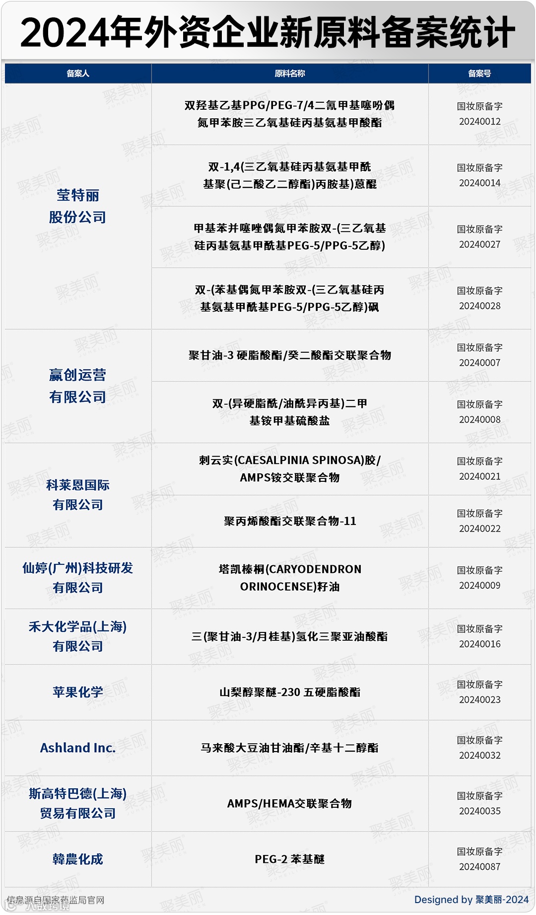 而从外资企业的布局来看,与2022年23家、2023年20家相比,今年备案新原料的外资企业数量有所下滑,尽管如此,也不乏新入局者的身影。譬如,今年就有莹特丽股份公司、赢创运营有限公司、禾大化学品(上海)有限公司、斯高特巴德(上海)贸易有限公司、韓農化成等企业首次在华备案新原料。