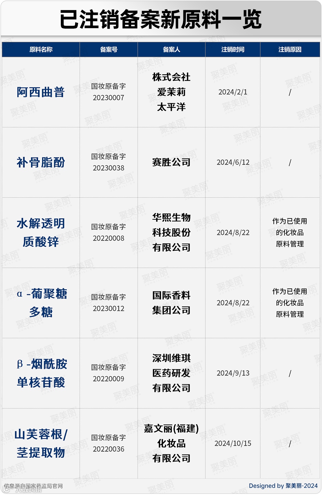 其中,已注销备案的6个新原料分别为,2022年备案的新原料——水解透明质酸锌、β-烟酰胺单核苷酸、山芙蓉根/茎提取物;2023年备案的新原料——阿西曲普、补骨脂酚、α-葡聚糖多糖。