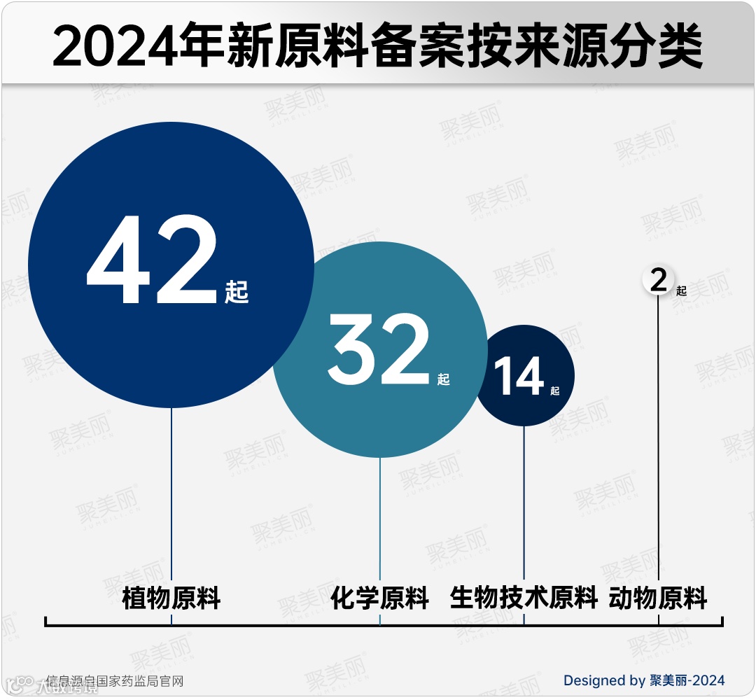 而在2024年备案的90个新原料中,植物原料的备案数从2023年的12个翻了三倍多,增至42个,一举抢占了化学原料的主导地位。反观化学原料,其主导地位已有所减弱,目前备案数仅有32个,生物技术原料和动物原料分别是14个和2个。