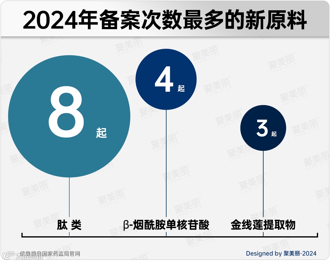 从统计来看,今年化妆品新原料备案释放出哪些趋势?在这些已备案的新原料中,哪类原料在备案潮中更具热度?进行新原料备案的企业又有哪些特点?聚美丽通过梳理发现,今年原料备案有5个比较鲜明的特点: