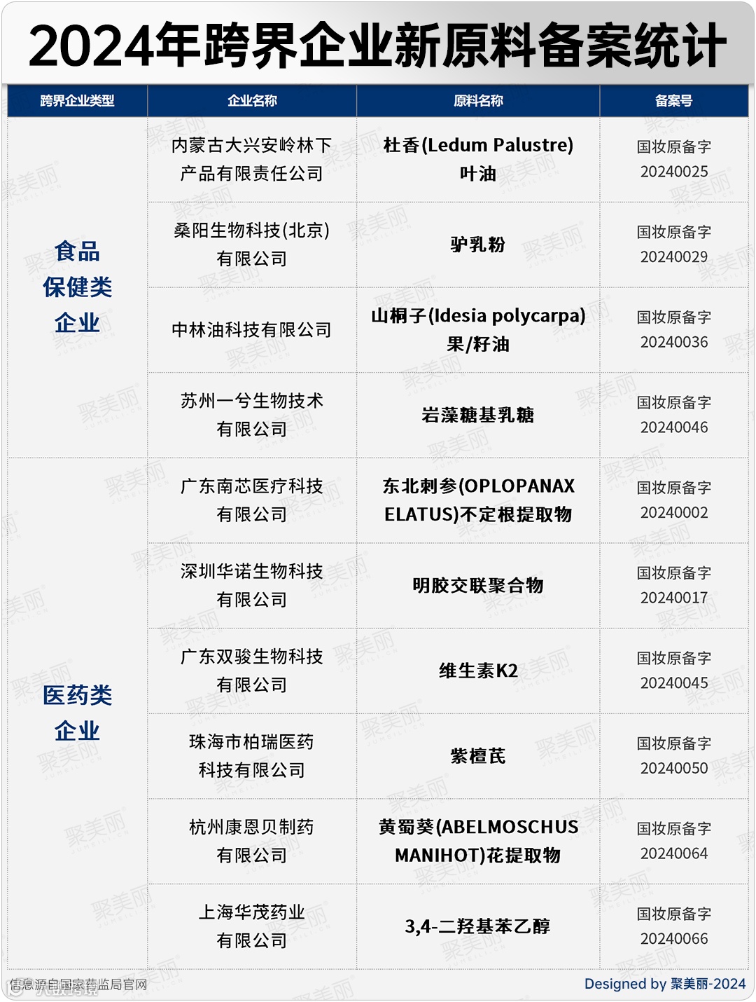除了美妆企业之外,今年新原料备案领域还涌入了一批跨界新玩家。据统计,跨界的企业玩家共有10家,涉及食品保健、医药等领域。