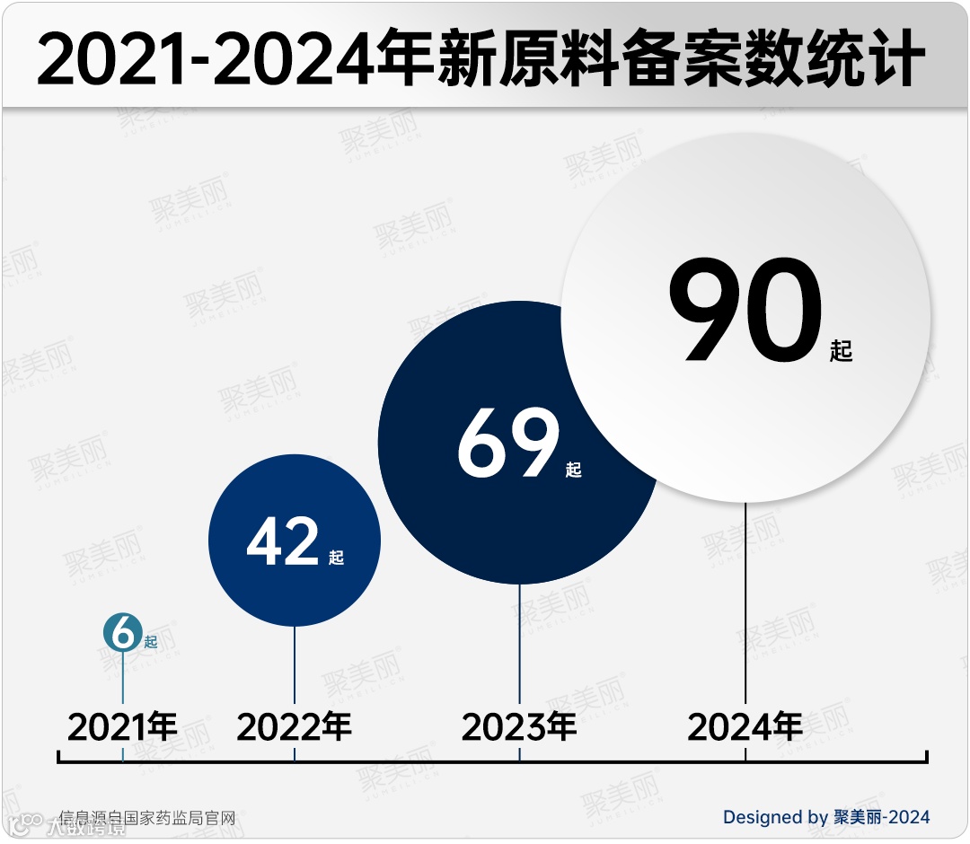 据统计,2024年以来,国家药监局官网共计90款新原料完成备案,而2023年、2022年与2021年分别备案69款、42款、6款。可见,2024年新原料备案热潮持续,备案数量全面赶超去年,同时这也意味着,中国化妆品原料正在强势崛起。