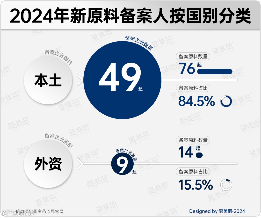 从备案人国别来看,2024年本土企业备案新原料共计76款,占比超8成,而外资企业备案新原料14款,仅占比15.5%。不难发现,在今年的新原料备案中,中国本土企业占比优势明显,这在一定程度上可以反映出,国货美妆原料创新活力的提升。