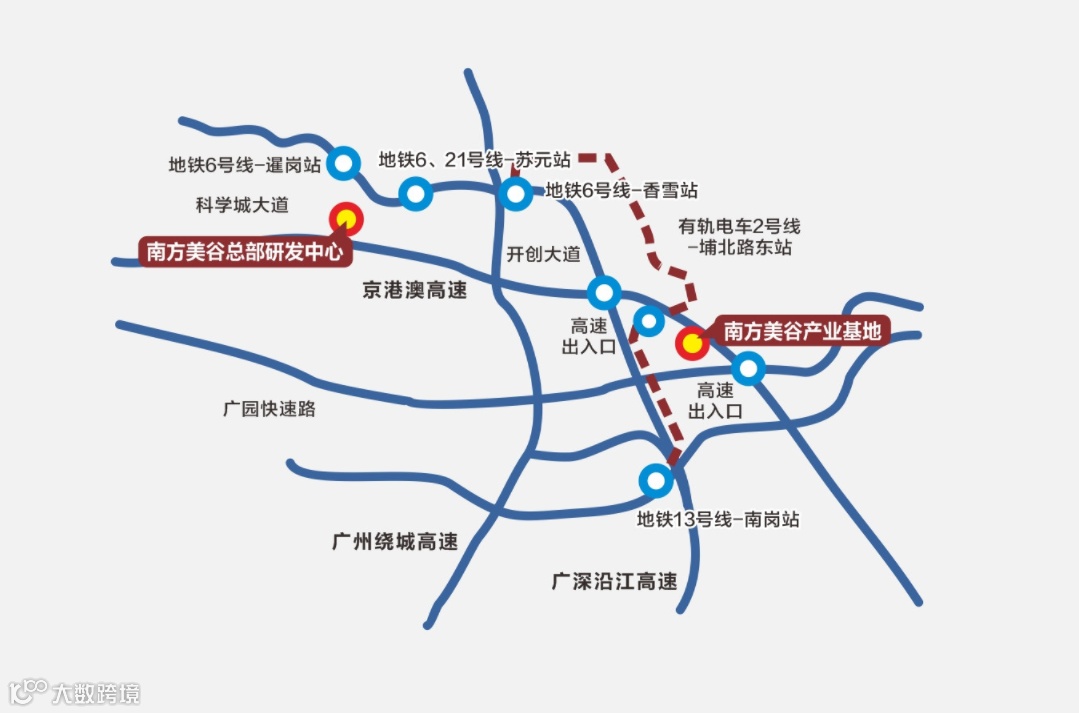 园区门口设有有轨电车2号线站点,连接有轨电车1号线、广州地铁6号线(香雪站)及13号线(南岗站),无缝换乘瞬间通达全城。