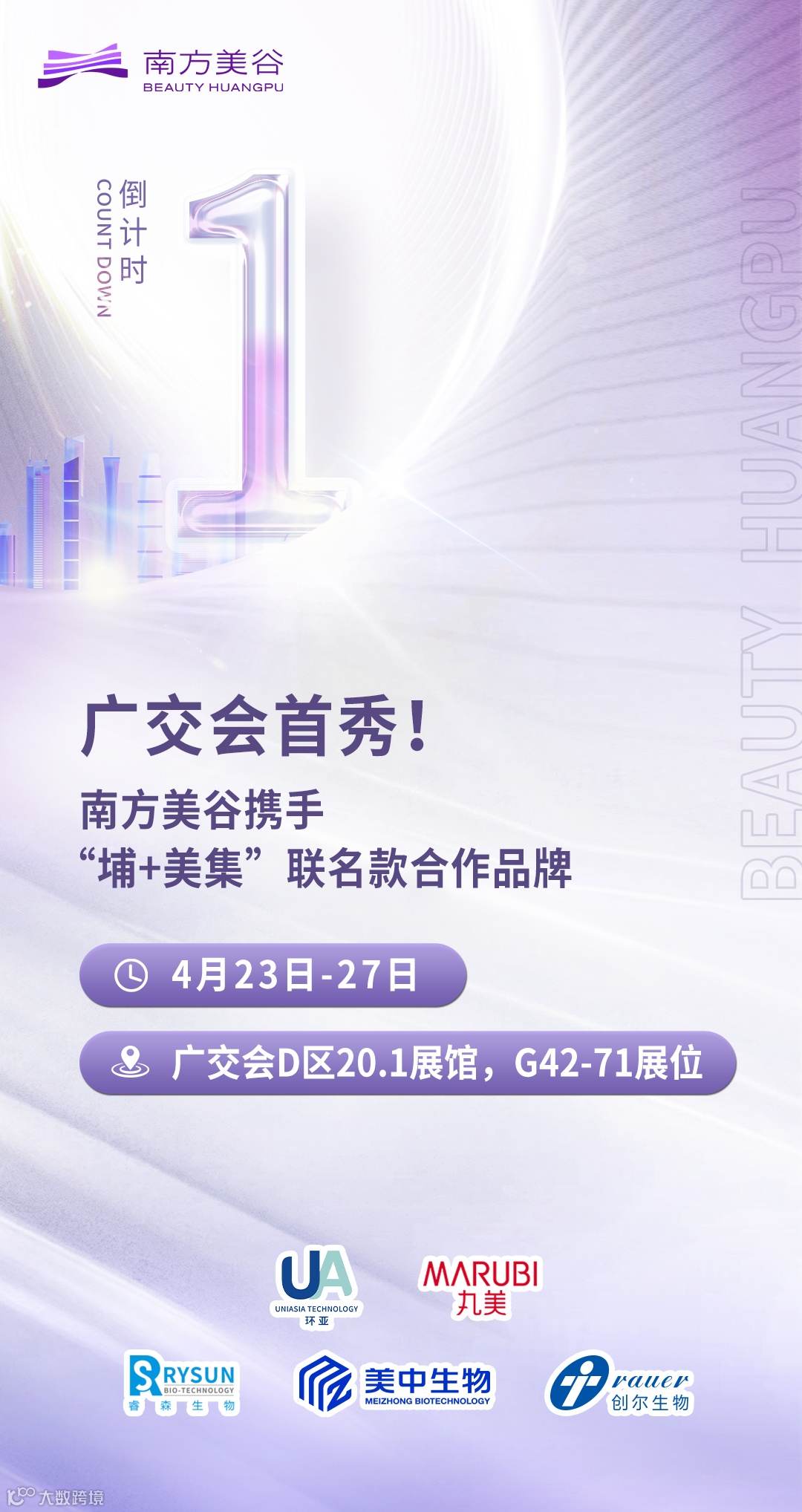 4月23日-27日,南方美谷作为广州市黄埔区、广州开发区的美妆大健康产业集群及区域产业品牌,将携手“埔+美集”产业联名明星款套盒合作企业——丸美、环亚、创尔、美中、中草集、睿森(企业排名不分先后),作为我区优质产业代表共同展出,面向世界讲好中国美妆大故事。