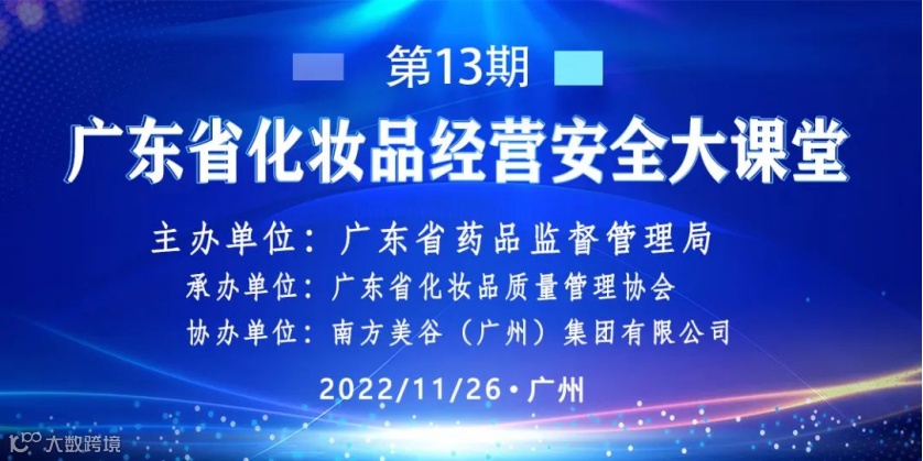 由广东省药品监督管理局主办、广东省化妆品质量管理协会承办、南方美谷(广州)集团有限公司协办的广东省化妆品经营安全大课堂(第13期)将于11月26日周六下午14:00 -17:00线上召开。