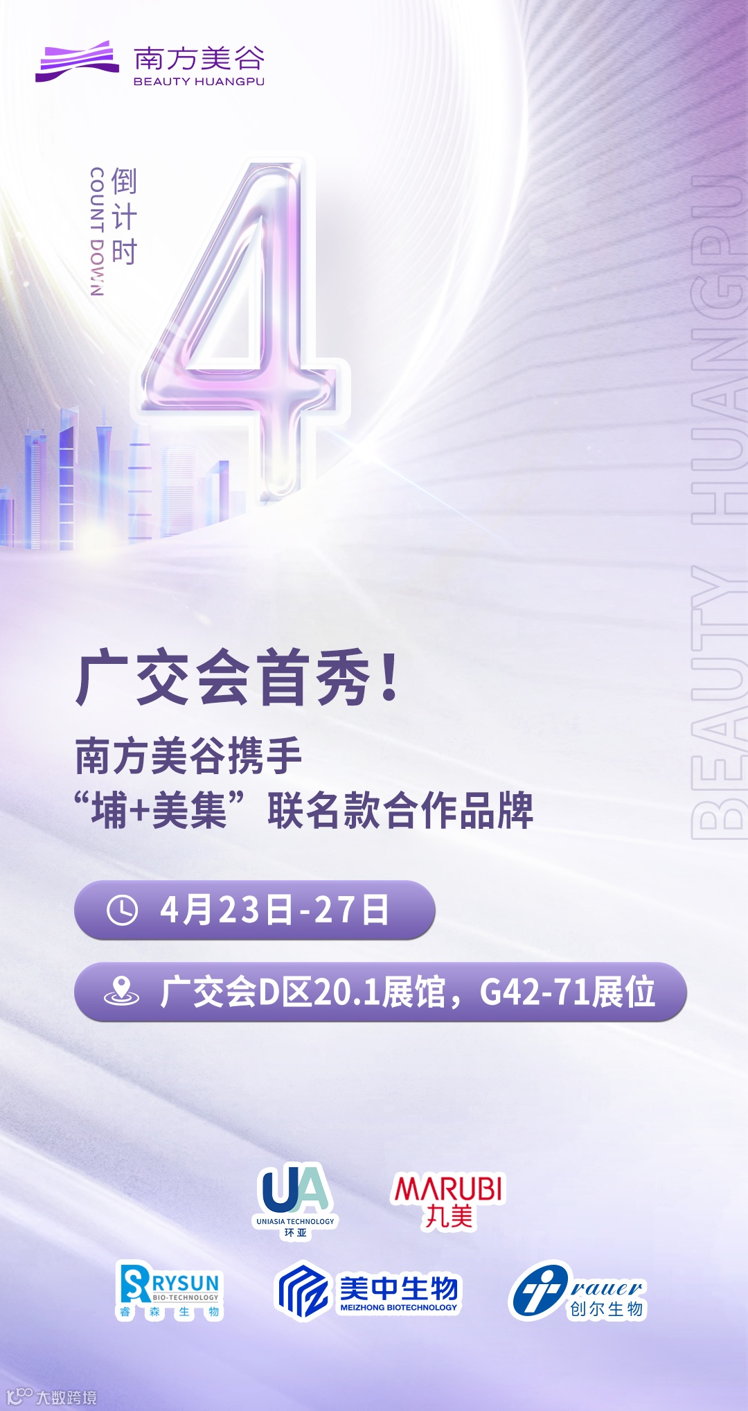 4月23日-27日,南方美谷作为广州市黄埔区、广州开发区的美妆大健康产业集群及区域产业品牌,将携手“埔+美集”产业联名明星款套盒合作企业——丸美、环亚、创尔、美中、中草集、睿森(企业排名不分先后),作为我区优质产业代表共同展出,面向世界讲好中国美妆大故事。