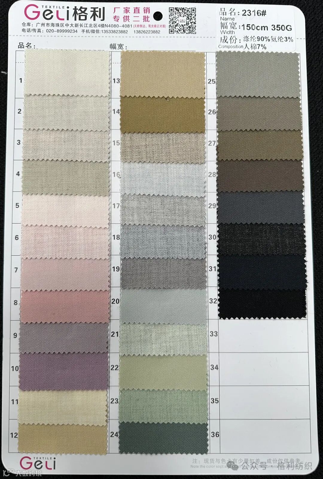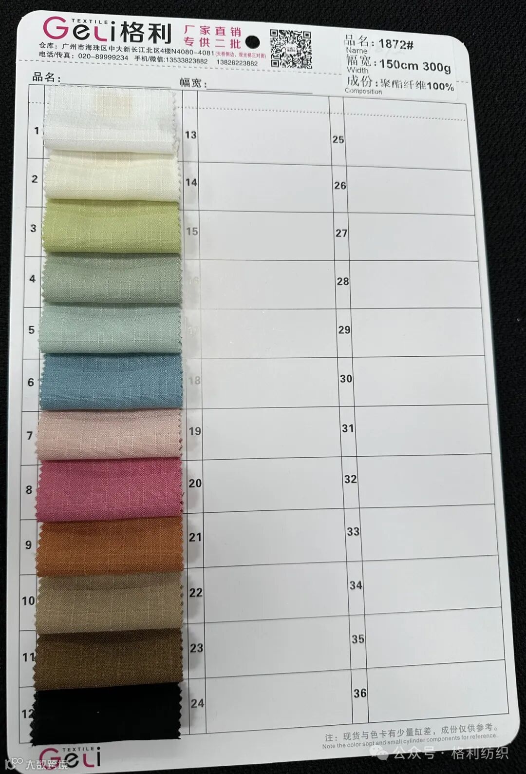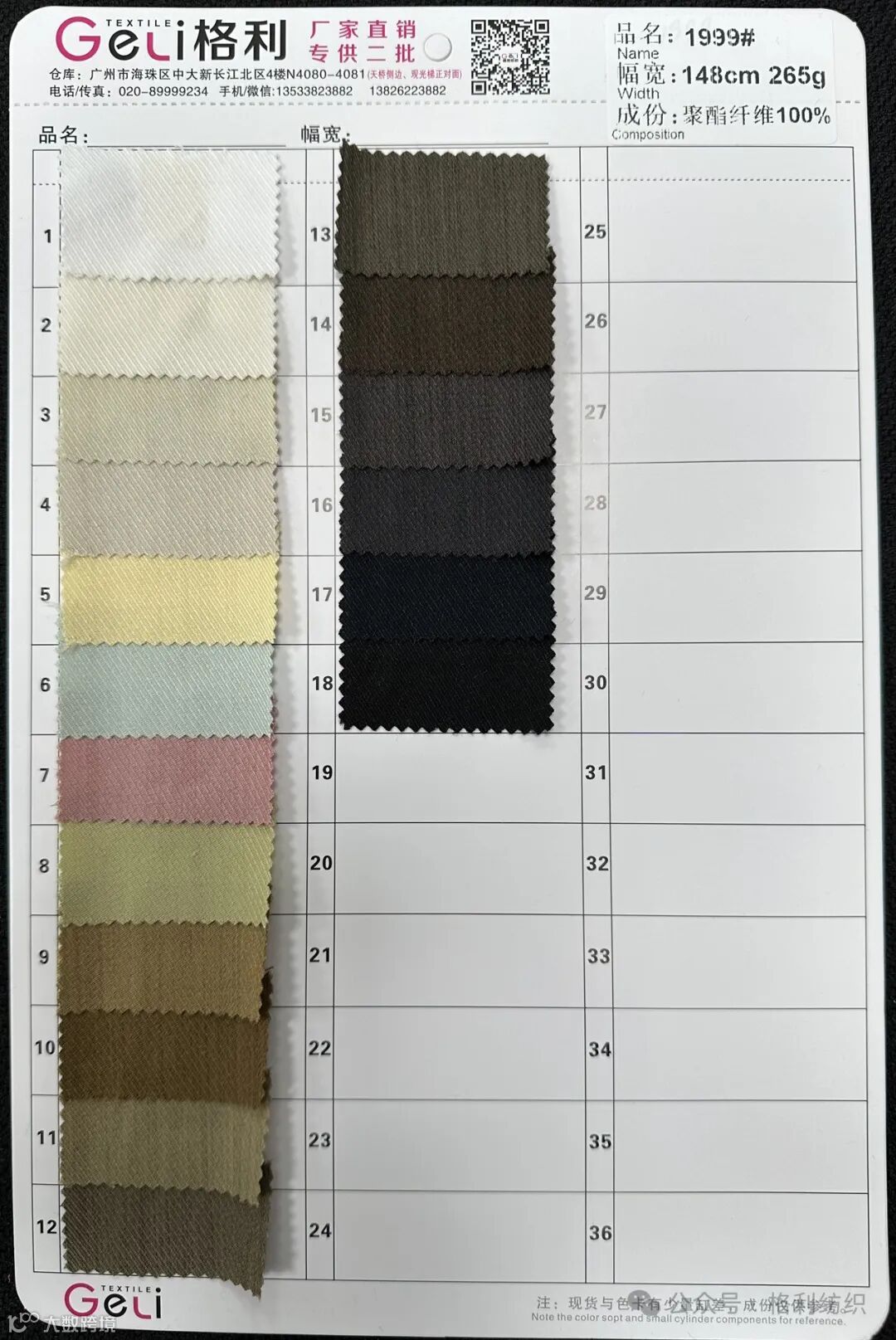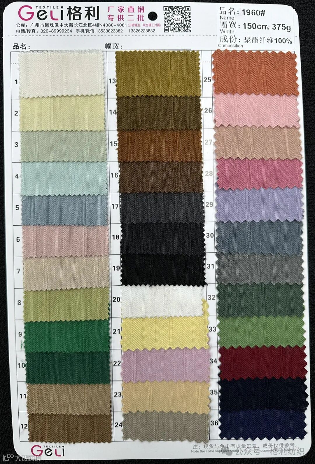感谢您关注广州新格利®纺织 ,我公司专业从事面料生产开发,TR色织格条,素色小香风,TR双色乐丽丝系列。欢迎广大客户前来咨询采购!地址:广州市海珠区中大新长江北区三楼N3183。☎️电话020 89999234 手机:13826223882