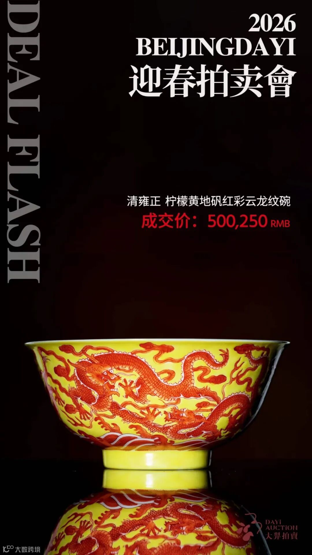 雍正瓷器在本场中表现尤为亮眼。一件珊瑚红地珐琅彩开光牡丹纹碗以 RMB 345,000 成交,另一件柠檬黄地矾红彩云龙纹碗则以 RMB 500,250 易主。