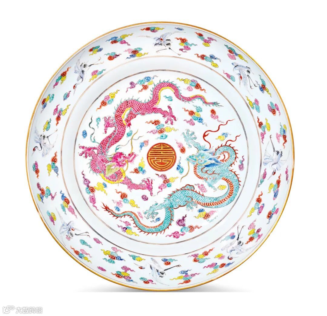 Lot 636 清雍正 粉彩云鹤双龙捧寿福山寿海纹折沿大盘