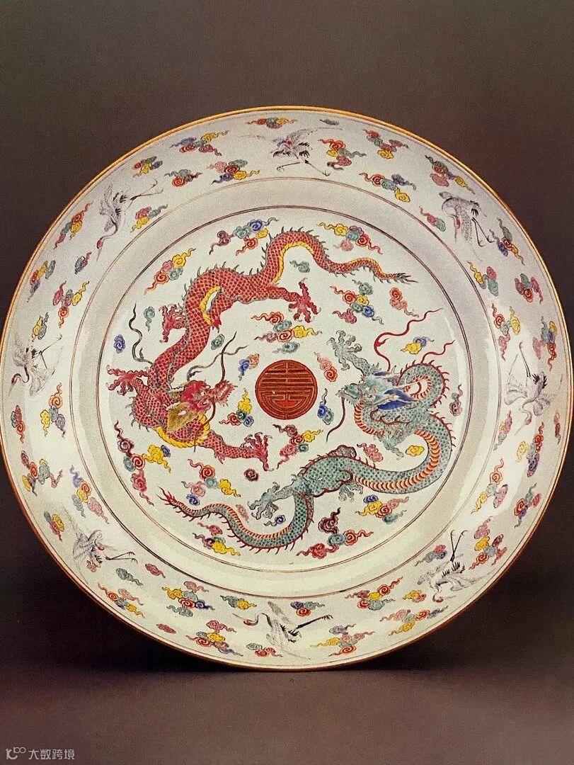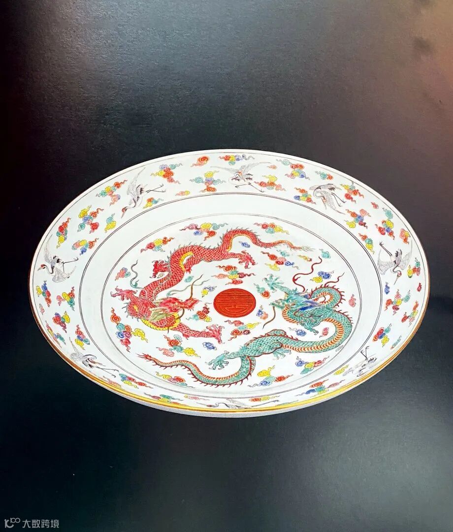 除云鹤双龙捧寿外,此类折腰盘另有盘心绘饰牡丹者,例见上海博物馆藏,馆藏编号:CI00070747。另见盘心绘山水高士图,售于伦敦苏富比,2011 年 11 月 9 日,编号 482,成交价10,534,500RMB。