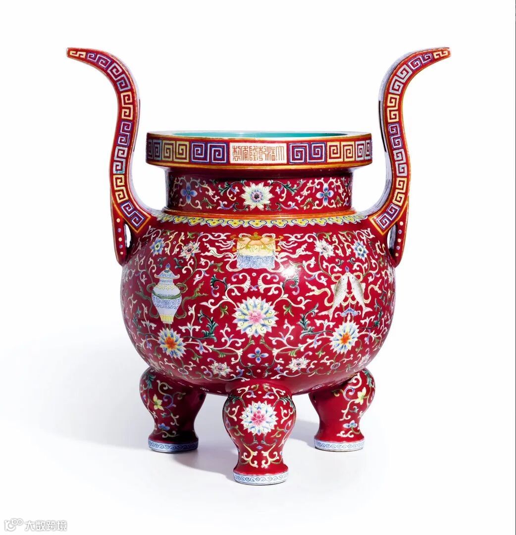 附图:香港苏富比 2014 年 10 月 8 日 编号 3638 清乾隆 粉彩紫地番莲八吉祥纹朝冠耳香炉