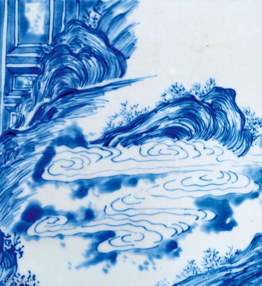 “披麻皴”作为山水画皴法之一,由五代董源创始,以长短线条的排列表现山石肌理,而作为瓷器的装饰手法,“披麻皴”晚明即出现,至康熙早期其技法发展已颇为成熟,本品所绘山石大面积使用披麻皴,形成“远视则景物粲然”的视觉效果。人物置于山水之中,悠然自得,饶有情致,给人以清新明快之感,画面效果讲究意境美,艺术感染力极强。 本品意境、构图、笔触与皴染皆师法文人山水画法绘制而成,其将复古与慕古的情怀从绢纸上转移至瓷面,极富文人趣味与美学理想,堪称熙朝文人瓷绘之典范。