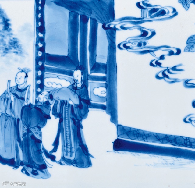 明末清初之际,戏曲、小说流行,版画艺术也发展迅速,尤以徽派版画刻画人物生动传神,广受社会欢迎,同时也对瓷器纹饰产生了重要影响。当时景德镇烧造的瓷器上所绘内容,多取材自通俗戏曲、小说中情节,将瓷画艺术推展到一个新的高峰。 笔筒外壁通景以青花描绘周成王桐叶封弟图:周成王在仪仗、随侍的簇拥下,手持桐叶,封弟叔虞于唐,叔虞举笏板躬身谢恩,随侍的数位大臣亦拱手祝贺。画面人物形象刻画精细,情节生动鲜活,青花浓淡变化自如,为康熙青花人物故事图的精美例证。