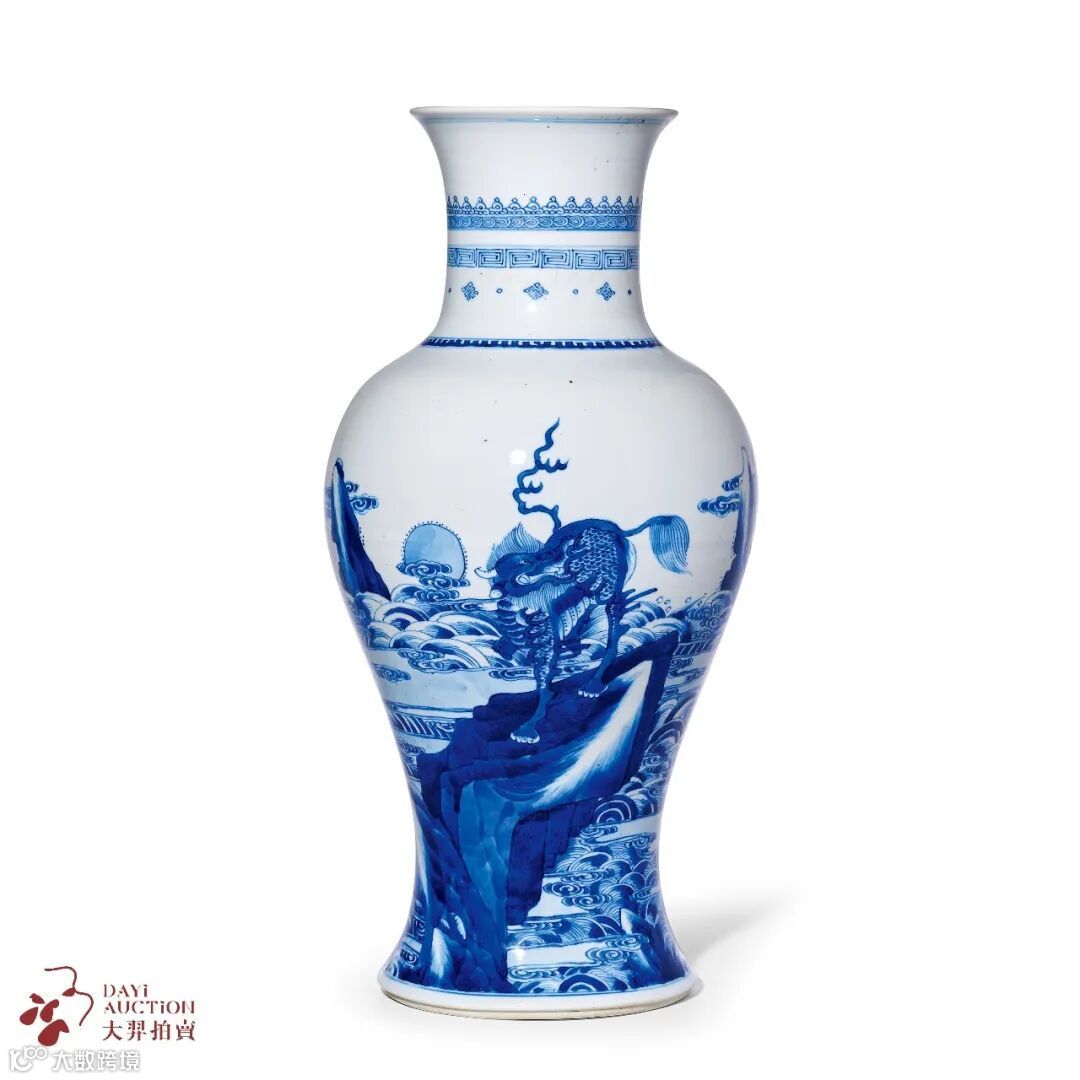 本品为康熙时期的常见造型,因形似观音而得名。瓶身挺拔,撇口、直颈、弧腹、撇圈足。器形规整,体量适中,瓶身以青花绘海水瑞兽纹饰,海水翻滚,瑞兽矫健,神采飞扬,颇具气势。整体用笔流畅,画面布局层次清晰,青花鲜丽明快、浓淡相宜,以分水法作出幽菁清新、浓淡相宜的渲染,表现海水之立体感,为康熙“蓝分五色”的典型代表,可谓是康熙青花器之范本,不为多见。整器胎体坚质细糯,通体施釉平滑明润,绘画流畅,绘制精细,加之此器挺拔少见,为康熙时期青花之佳作,具有极高的欣赏收藏价值。