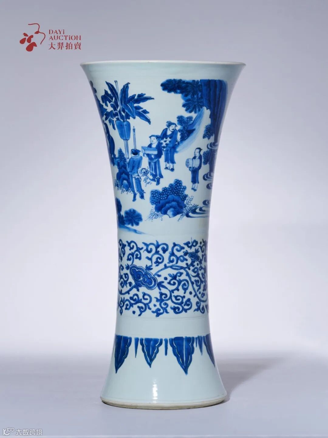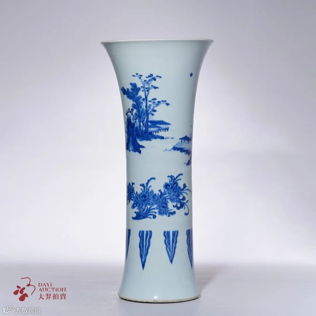 此觚大口外侈,长颈,筒形身,底部外撇。外壁以颈、腹、胫为限分为三个部分。明末清初器型之要务不以复杂为主,而是烧造更适合文人瓷画之器皿,花觚遂成此时佳例。既有仿古之风貌,又暗合文人画意之需求,陈设得宜。故明末清初之际,瓷质花觚开始大量制作,本品外壁延续瓷画之风格,以山水楼阁为题,腹部凸起处绘饰折枝花,胫部绘蕉叶纹。青花发色青翠,浓淡有致,画面格调幽雅,绘饰游刃有余,收放自如。