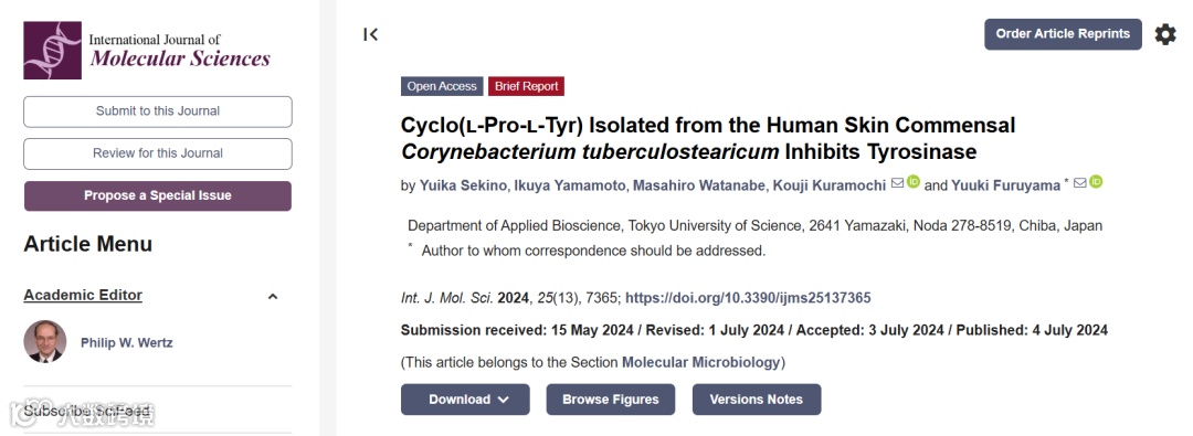 近期,来自东京理科大学(以下简称:TUS)的研究人员就从常见于人类皮肤的结核硬脂棒状杆菌(C.tuberculostearicum)中发现了一种很有前途的酪氨酸酶抑制剂——cyclo(L-Pro-L-Tyr)。这项研究由日本TUS应用生物科学系助理教授Yuuki Furuyama领导,于今年7月发表在《International Journal of Molecular Sciences》上。
