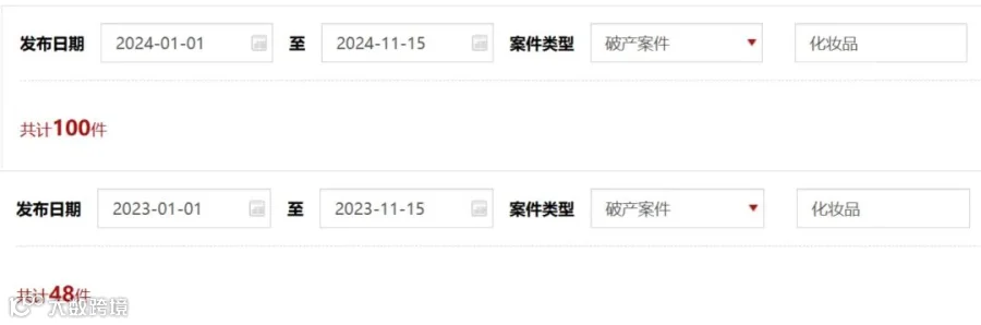 我们在全国企业破产重整案件信息网上,以“化妆品”、“破产案件”为关键词进行搜索发现,自今年年初至今,有100件与化妆品相关破产的案件。
