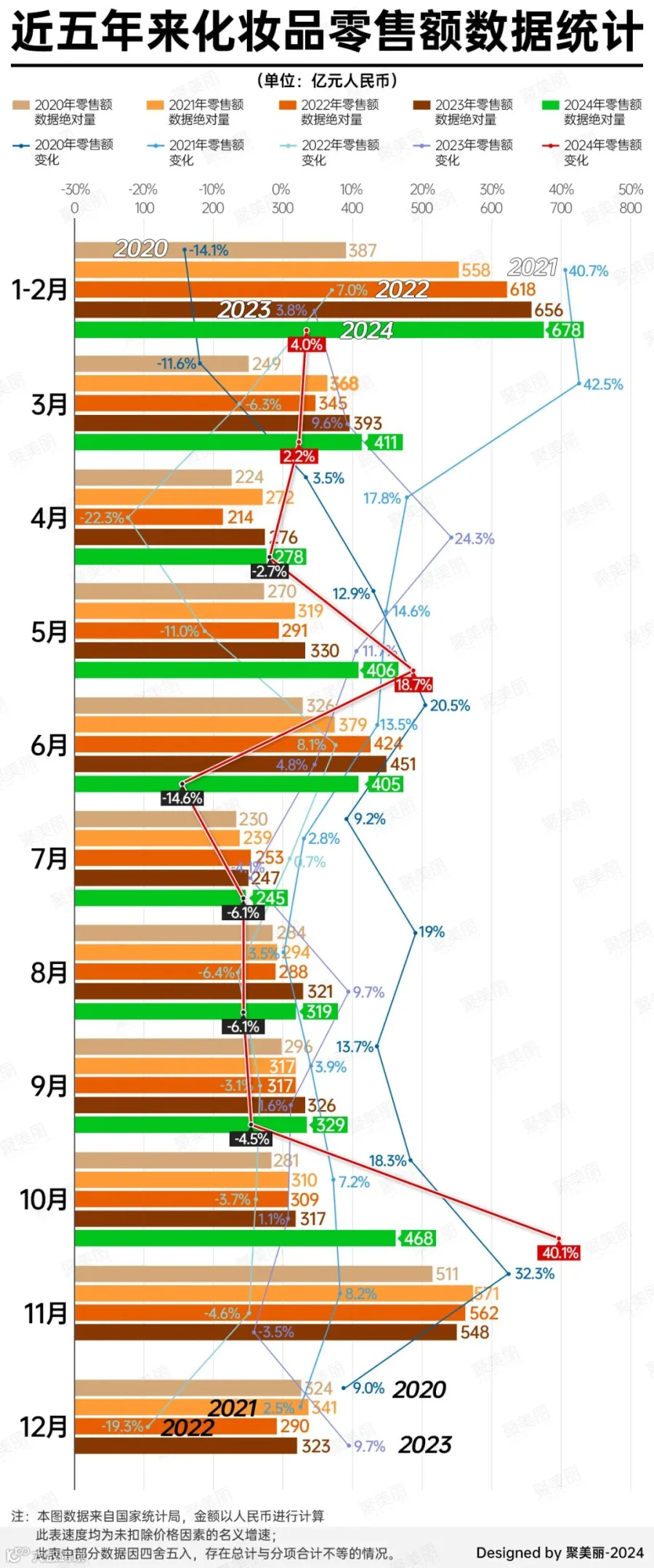 另外,对比往年,除10月份的数据外,今年各月份化妆品类零售额均呈放缓。