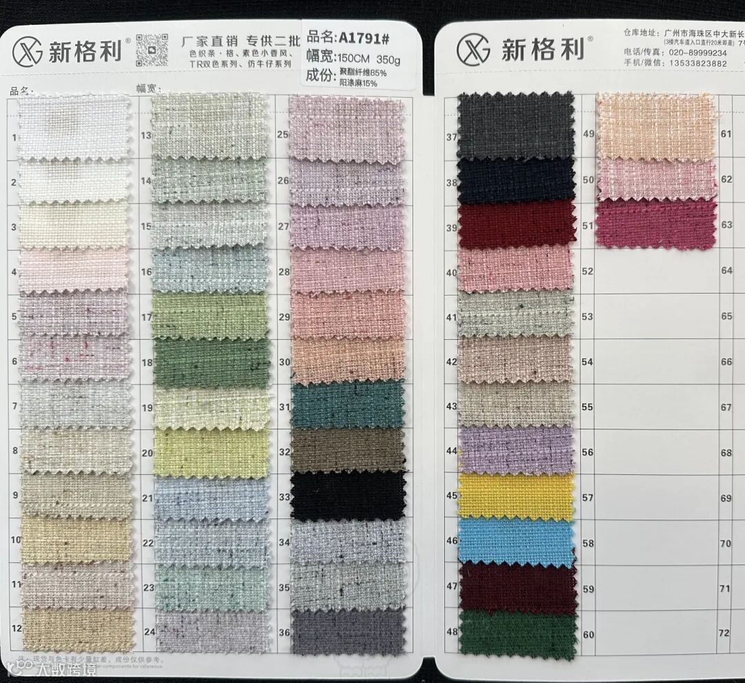 感谢您关注广州新格利®纺织 ,我公司专业从事面料生产开发,TR色织格条,素色小香风,TR双色乐丽丝系列。欢迎广大客户前来咨询采购!地址:广州市海珠区中大新长江北区三楼N3183。☎️电话020 89999234 手机:13826223882